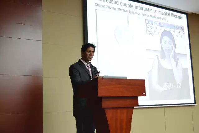 行为信号处理(Behavioral SignalProcessing)指的是定量及客观地理解典型与非典型的人类行为的技术和算法。报告会上,Narayanan教授具体介绍了人类行为数据采集和处理方面的进展与挑战,包括其实验室近期围绕交流、情感和社会行为等方面的行为信号处理所开展的研究工作,并举例说明了行为信号处理技术在医疗和健康等领域的应用情况。报告会上,Narayanan教授还对参会师生提出的问题进行了解答和讨论。